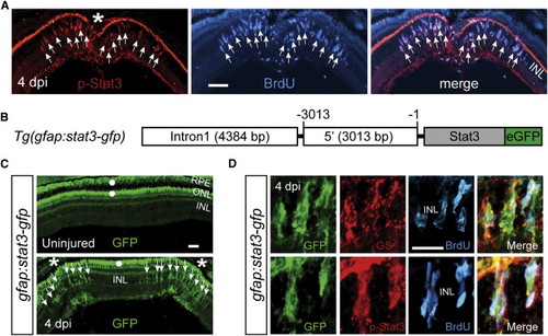 The Jak/Stat3 Signaling Pathway Is Activated following Retinal Injury (A) Immunofluorescence on retinal sections shows activated p-Stat3 expression in BrdU+ MG-derived progenitors that are localized to the injury site at 4 dpi. (B) A schematic of the gfap:stat3-gfp transgene construct shows the fusion gene, stat3-gfp, under control of the gfap promoter regulatory elements. (C) In gfap:stat3-gfp transgenic fish, Stat3-GFP fusion protein expression is undetectable in MG of the uninjured eye and is restricted to MG-derived progenitors at the injury site at 4 dpi. White dots indicate autofluorescence unique to the green channel (see Figure S2G). (D) Confocal images show colocalization of Stat3-GFP with GS+/p-Stat3+/BrdU+ MG-derived progenitors at 4 dpi. In (A) and (C), the asterisk marks the injury site (needle poke) and arrows point to MG-derived progenitors. Scale bars, 50 µm (A and C) and 20 µm (D). INL, inner nuclear layer; ONL, outer nuclear layer; RPE, retinal pigment epithelium; dpi, days postinjury. See also Figures S1 and S2. |