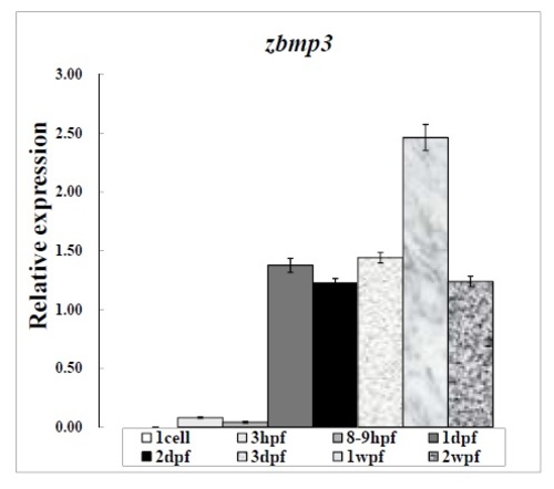 Expression study of zbmp3 by real-time PCR using samples from 1 cell, 3 hpf, 8-9 hpf, 1 dpf, 2 dpf, 3 dpf, 1 wpf, and 2 wpf time points. |