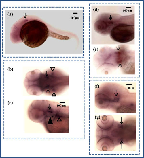 In situ hybridization of zbmp3 in developing zebrafish. (a) Lateral view of a 1 dpf zebrafish. Arrow indicates otic vesicle. (b) Dorsal view of a 2 dpf zebrafish. Arrows indicate otic vesicles and arrowheads show pectoral fins. (c) Lateral view of a 2 dpf zebrafish. Arrow indicates otic vesicle, black arrowhead shows opercle and branchiostegal ray, and white arrowhead shows pectoral fin. (d) Lateral view of a 3 dpf zebrafish. Arrow indicates otic vesicle. (e) Dorsal view of a 3 dpf zebrafish. Arrows indicate otic vesicles. (f) Lateral view of a 5 dpf zebrafish. Arrow indicates otic vesicle. (g) Dorsal view of a 5 dpf zebrafish. Arrows indicate otic vesicles. |