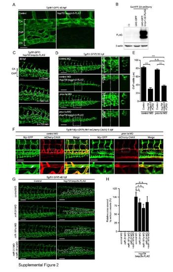 Bmp Regulates CVP Formation. Related to Figure 2. (A) Confocal z-stack images of the caudal regions of 48 hpf Tg(fli1:GFP) embryos injected without (Control) or with hsp70l:noggin3-FLAG Tol2 plasmid and heat-shocked at 22 hpf for 2 h. Note that overexpression of Noggin3-FLAG, a Bmp antagonist, inhibited formation of CV and CVP, but did not affect CA formation. (B) 293T cells were transfected without (-) or with Gal4-driven expression vector encoding GFP (UAS:GFP) or that encoding both GFP and Bmpr1ΔC-FLAG (UAS:GFP,bmpr1ΔC) together with the plasmid encoding Gal4FF-2A-mCherry, and subjected to Western blot analysis with anti-FLAG and anti-β-actin antibodies. A UAS:GFP,bmpr1ΔC plasmid can drive expression of GFP and Bmpr1ΔC-FLAG simultaneously in a Gal4-dependent manner. (C) Confocal z-stack images of the caudal regions of 36 hpf Tg(fli1:GFP) embryos injected with hsp70l:bmp2b-FLAG Tol2 plasmid and heat-shocked at 24 hpf for 30 min and its subsequent time-lapse images at the indicated time point. Dotted lines indicate ectopic venous vessels. Note that overexpression of Bmp2b resulted in formation of ectopic vessels sprouted from the CVP. (D) Projection view of confocal z-stack images on the caudal region of 33 hpf Tg(fli1:GFP) embryos injected with 5 ng control MO or 5 ng prox1a MO together without or with hsp70l:noggin3-FLAG Tol2 plasmid are shown, as in Figure 1G. (E) The width of CVP as observed in D was quantified, as in Figure 1H (control MO [n=8], control MO + hsp70l:noggin3-FLAG [n=9], prox1a MO [n=9], prox1a MO + hsp70l:noggin3-FLAG [n=8]). (F) 3D-rendered confocal images of the trunk regions of 5 day postfertilization (dpf) Tg(fli1:Myr-GFP);(flk1:mCherry-CAAX) embryos injected with 5 ng control MO or 5 ng prox1a MO. GFP (Myr-GFP), mCherry (mCherry-CAAX) and the merged images (GFP, green; mCherry, red) are shown as indicated at the top. The boxed areas are enlarged on the panels beneath the original images. Arrows indicate thoracic duct. Note that prox1a morphant exhibited defective formation of thoracic duct. (G) Projection view of confocal z-stack images of the caudal regions of 48 hpf Tg(fli1:GFP) embryos injected with 5 ng control MO (control MO), 5 ng miR-31 MO (miR-31 MO), 5 ng miR-181a MO (miR-181a MO) or a mixture of 5 ng miR-31 MO and 5 ng miR-181a MO (miR-31 MO + miR-181a MO) together without (Control) or with hsp70l:bmp2b-FLAG Tol2 (hsp70l:bmp2b-FLAG) plasmid, and heat-shocked at 24 hpf for 30 min. Dotted lines indicate ectopic venous vessels. Note that knockdown of miR-31 and/or miR-181a did not affect Bmp2b-induced formation of ectopic venous vessels. (H) The area covered by ectopic venous vessels as observed in G was quantified and expressed as percentages relative to that observed in the embryos injected with both control MO and hsp70l:bmp2b-FLAG-Tol2 plasmid. Data are shown as mean ± s.e.m. (n=3). Scale bars, 50 µm (A and F) and 100 µm (D and G). ***p<0.001. n.s., no significance.