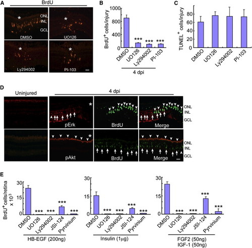 Mapk/Erk, PI3K/Akt, β-Catenin, and Jak/Stat Signaling Regulate Injury and Growth Factor-Stimulated MG Proliferation (A and B) Mapk/Erk inhibitor (UO126) or PI3K inhibitors (Ly294002 or PI-103) reduce the number of BrdU+ progenitors at 4 dpi. Asterisks identify the injury site. Scale bar represents 50 µm. Error bars represent SD; p < 0.001; n = 6. (C) TUNEL assay shows Mapk and PI3K inhibitors have no effect on cell death. (D) pErk and pAkt immunofluorescence in uninjured and injured (4 dpi) retinas. Asterisks identify the injury site. In the pErk panels, arrows point to pErk+ MG and arrowheads point to BrdU+ cells. In pAkt panels, arrowheads point to pAkt+ cells, while arrows point to BrdU+ cells. Scale bar represents 50 µm. (E) In the growth factor stimulated, but uninjured retina, BrdU+ progenitor formation is suppressed by inhibiting Mapk (UO126), PI3K (Ly294002), Jak/Stat (JSI-124) or β-catenin (pyrvinium) signaling. Error bars represent SD; p < 0.001; n = 5. See also Figures S2–S4. |