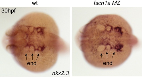 nkx2.3+ pharyngeal endoderm is patterned normally in fscn1a MZ embryos. Whole-mount in situ hybridyzation for nkx2.3 in wild type and fscn1a MZ embryos at 30 hpf showing normal endodermal (end) pouch formation. |