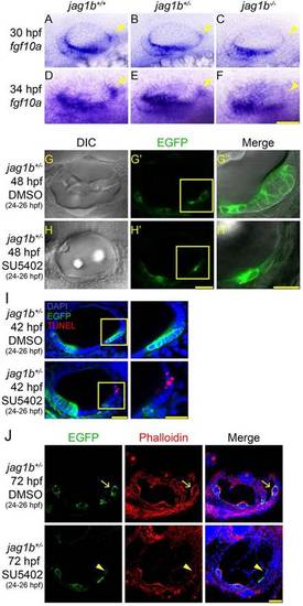 fgf10a RNA levels are specifically reduced at the posterior prosensory domain in jag1b-/- embryos. (A-F) Whole-mount in situ hybridization of jag1b+/+, jag1b+/- and jag1b-/- embryos at 30 and 34hpf. Lateral views. Scale bar: 20µm. (G-H′′) Posterior cristae in jag1b+/- embryos treated with DMSO (G-G′′) or SU5402 (H-H′′) at 24-26hpf. Dorsolateral views. Scale bars: 50µm in G-H′; 10µm in G′′ and H′′. (I) TUNEL staining of jag1b+/- embryos treated with DMSO or SU5402. Apoptosis signals are detected in the posterior prosensory domain of the SU5402-treated jag1b+/- embryos at 42hpf. Dorsolateral views. Scale bars: 40µm (left) and 20µm (right). (J) Phalloidin staining of jag1b+/- embryos treated with DMSO or SU5402. Lateral views. Scale bar: 50µm. Anterior towards the left and dorsal upwards. Boxed regions are enlarged on the right. Arrows and arrowheads indicate posterior crista regions. |