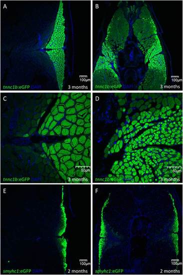 Disruption of fiber type identity in adultsox6mutant fish. (A,B) at 3 months, expression of the tnnc1b:eGFP reporter is restricted to the medio-lateral wedge of slow-twitch fibers in wild-type fish. (C,D) In sox6 mutants, the reporter gene is also expressed at lower levels in fast-twitch fibers while the slow-twitch fibers extend closer to the midline. The diameter of the slow-twitch fibers is significantly reduced compared to wild-type (cf. B and D). (E) The smyhc1:GFP reporter is expressed at high levels in the slow-twitch fiber of 2-month-old fish. (F) the reporter shows a similar pattern of expression in sox6 mutants at the same stage, with lower level expression extending more medially than in wild type.