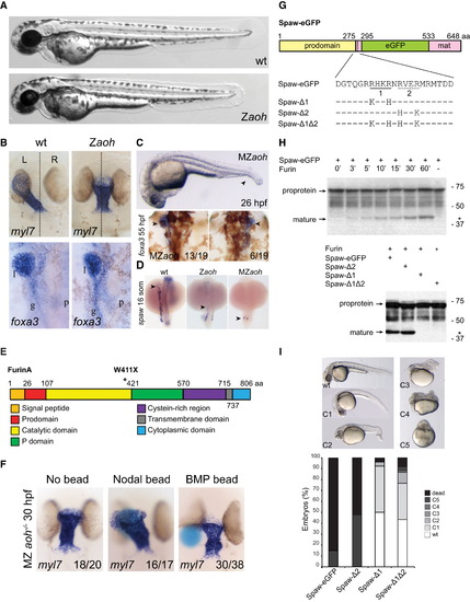 Zygotic and Maternal Zygotic aoh Mutants Display Laterality Phenotypes and Defects in the Nodal Signaling Pathway (A) Lateral view of WT and Zaoh mutant embryos at 48 hpf. (B) Characterization of the Zaoh mutant heart and gut phenotype. ISH at 28 hpf for myl7 and at 55 hpf for Foxa3 (dorsal view; anterior top). (C) At 26 hpf, MZaoh mutant embryos displayed slight developmental delay and a mild dorsalization phenotype in the tailfin (arrowhead). At 55 hpf, incidence of reversed gut looping and organ position was observed (arrowhead pointing at liver). (D) ISH for spaw (arrowhead indicates anterior-ward expansion) in WT, Zaoh, and MZaoh embryos. (E) FurinA protein and functional domains. Star, aoh mutation. (F) Agarose beads preincubated in recombinant BMP and Nodal protein were implanted in MZaoh mutant embryos at 15 somites. Analysis of heart position was determined by myl7 ISH. (G and H) Spaw-EGFP fusion protein (G). Furin recognition sites 1 and 2 are underlined. Changes in amino acids in the noncleavable forms are detailed (H) western blot with anti-GFP. Incubation of Spaw with Furin results in cleavage and appearance of the mature 41 kDa Spaw-EGFP (asterisk). Incubation of the different Spaw-EGFP variants with Furin demonstrates that cleavage happens only at the single (optimal) predicted Furin cleavage site 1. (I) Dorsalization phenotypes induced by injection of Spaw-EGFP variants mRNA (1 picogram [pg]) at 24 hpf. Abbreviations, liver (l), pancreas (p), and gut (g). |