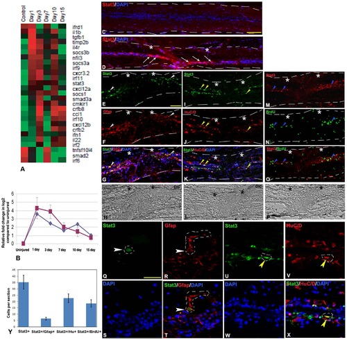 Differentially expressed genes related to inflammatory response and validation of stat3 expression in uninjured and injured zebrafish spinal cord. A) Dendrogram representing genes related to regulation of inflammation. Each horizontal line indicates the expression pattern of each gene and the vertical columns indicate the uninjured control and time points after SCI. The color chart indicates mean fold change of gene expression in each time points. Red and green colors represent increased and decreased expression respectively. B) Quantitative RT-PCR of stat3 expression showing fold change (red graph) and pattern of expression at different time points after injury. The temporal expression pattern of qRT-PCR (red graph) was compared with results of microarray analysis (blue graph). Error bars represent SEM, n = 3, p<0.01. C) A longitudinal section of uninjured cord stained with STAT3 and DAPI. D) A longitudinal section of 1 dpi cord showing many STAT3 positive cells (white arrows) close to the injury epicenter (double white stars) counter stained with DAPI. E–H) A longitudinal section of 3 dpi cord double stained with STAT3 and radial glial marker- GFAP, showing individual panels of STAT3 (E), GFAP (F), merge with DAPI (G) and DIC (Differential interference contrast) (H). A few STAT3+ cells are colocalized with GFAP+ cells (white arrowheads) close to injury epicenter. I–L) A longitudinal section of 3 dpi cord showing colocalization of STAT3 and newly formed neuronal marker, HuC/D with individual panels of STAT3 (I), HuC/D (J), merge with DAPI (K) and DIC (L). Some of the STAT3+ cells are colocalized with HuC/D+ cells (yellow arrowheads) close to the injury epicenter. M–P) A longitudinal section of 3 dpi cord colocalized with STAT3 and proliferating cell marker, BrdU shows individual panels of STAT3 (M), BrdU (N), merge (O) and DIC (P). Proliferating BrdU+ cells are also colocalized with STAT3+ cells (blue arrowheads) close to the injury epicenter. White dashed line in panel C to P mark the boundary of spinal cord tissue. Q–T) A representative higher magnification of 3 dpi cord section shows individual panels like STAT3 (Q), GFAP (R), DAPI (S) and merge (T). A STAT3+ cell (white arrowhead; the boundary of the cell nucleus is markedby white dashed line) is colocalized with GFAP+ radial glia (white arrowhead; the boundary of the cytoplasm of radial glia is marked by white dashed line). U–X) A representative higher magnification of 3 dpi cord section shows individual panels like STAT3 (U), HuC/D (V), DAPI (W) and merge (X). A STAT3+ cell (yellow arrowhead; the boundary of the cell nucleus is marked by white dashed line) is colocalized with HuC/D+ newly formed neuron close to ependyma (yellow arrowhead; the boundary of the cell nucleus is marked by white dashed line). Y) Quantitative analysis of STAT3+, STAT3+/GFAP+, STAT3+/HuC/D+ and STAT3+/BrdU+ cells in 3 dpi cord in longitudinal sections. The value represented as Mean±SEM of individual longitudinal section, n = 5 cord, p<0.01.Scale bar = 200 µm (C–D); 50 µm (E–P), 20 µm (Q–X). |