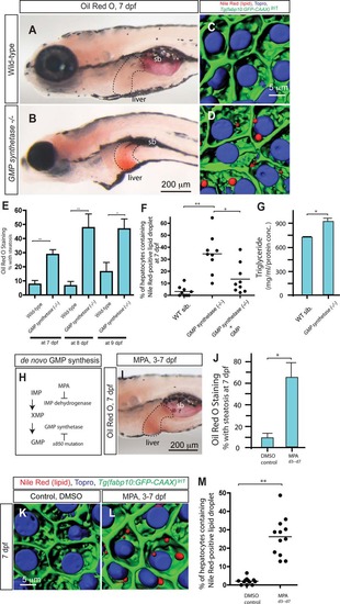 Lack of de novo GMP synthesis leads to hepatic steatosis. (A,B) Lateral views of wild-type sibling and GMP synthetases850 mutant larvae stained with Oil Red O (ORO) at 7 dpf. GMP synthetases850 mutant larvae develop liver steatosis at 7 dpf. Broken lines outline the liver. (C,D) Projected confocal images of the wild-type sibling (C) and GMP synthetases850 mutant (D) liver visualized for Nile Red (red) and To-pro-3 (blue) staining and Tg (fabp10:GFP-CAAX)lri1 (green) expression at 7 dpf. In GMP synthetases850 mutant larvae, lipid droplets stained by Nile Red are evident in hepatocytes. (E) The percentage of wild-type and GMP synthetases850 mutant larvae showing liver steatosis scored by whole-mount ORO staining at 7, 8, and 9 dpf. ORO staining experiments with wild-type larvae at 7, 8, and 9 dpf were repeated five times (total n = 138 larvae examined and total n = 4 showed ORO signal in the liver), five times (total n = 74 larvae examined and total n = 9 showed ORO signal in the liver), and six times (total n = 67 larvae examined and total n = 13 showed ORO signal in the liver), respectively. ORO staining experiments with GMP synthetases850 mutant larvae at 7, 8, and 9 dpf were repeated five times (total n = 124 larvae examined and total n = 36 showed ORO signal in the liver), four times (total n = 34 larvae examined and total n = 15 showed ORO signal in the liver), and three times (total n = 26 larvae examined and total n = 12 showed ORO signal in the liver), respectively. (F) Quantification of liver steatosis measured by the percentage of hepatocytes containing Nile Red positive lipid droplets in wild-type sibling (n = 9), GMP synthetases850 mutant (n = 9), and 150 µM GMP-treated GMP synthetases850 mutant larvae (n = 9). The percentage of hepatocytes containing lipid droplets is significantly increased in GMP synthetases850 mutant larvae. (G) Triglyceride levels measured in whole-body extracts of wild-type and GMP synthetases850 mutant larvae at 7 dpf. (H) A schematic of the de novo GMP synthesis pathway. In the linear de novo GMP synthesis pathway, IMP is converted to XMP by IMP dehydrogenase, and subsequently, XMP is converted to GMP by GMP synthetase. MPA inhibits the function of IMP dehydrogenase. The s850 mutation disrupts the function of GMP synthetase. (I) Wild-type larvae exposed to MPA from 3 to 7 dpf were fixed and stained with ORO at 7 dpf. MPA-treated larvae developed liver steatosis. (J) The percentage of control DMSO or MPA-treated larvae showing liver steatosis scored by whole-mount ORO staining at 7 dpf. MPA treatment increased the percentage of larvae showing liver steatosis. ORO staining experiments with MPA-treated larvae were repeated three times with an average n = 35.4 larvae per experiment (total n = 106 larvae examined and total n = 70 larvae showed ORO signal in the liver). (K,L) Projected confocal images of wild-type larvae treated with DMSO (K) or MPA (L) from 3 to 7 dpf visualized for Nile Red (red) and To-pro-3 (blue) staining and Tg (fabp10:GFP-CAAX)lri1 expression (green). Nile Red stains lipid droplets, and Topro stains nuclei. (M) Quantification of liver steatosis measured by the percentage of hepatocytes containing lipid droplets in DMSO-treated control and MPA-treated larvae at 7 dpf. MPA-treatment significantly increased the percentage of hepatocytes containing lipid droplets. sb, swim bladder. *P < 0.05, **P < 0.01; error bars indicate SD. |