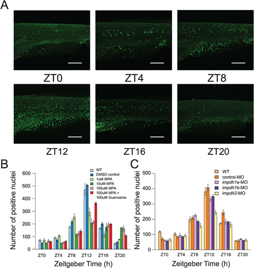 impdh2 mediates the circadian control of cell cycle. (A) The BrdU staining in 5 dpf larvae represents the daily rhythm of S phase in cell cycle under LD conditions. (B) The amplitude of the S phase rhythm was attenuated when the larvae were treated with MPA. The effect of MPA was rescued when guanosine was added to MPA-treated larvae. The inhibitory effect of MPA on the S phase rhythm was in a dose-dependent manner and saturated at 10μM concentration. (C) The amplitude of the S phase rhythm decreased significantly in impdh2 morphants. At least three larvae were measured at each data point. Error bars represent the standard error of mean (SEM) among independent biological replicates. Scale bars, 200μm. |