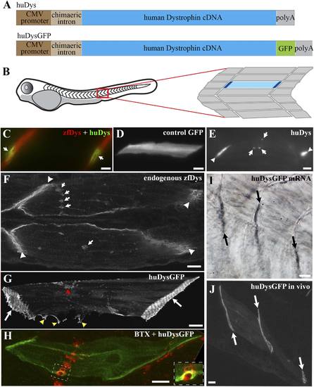 Human Dystrophin expression in the zebrafish embryo. (A) Main features of the human Dystrophin expression constructs engineered for this study. (B) Schematic illustrating 2 dpf zebrafish embryo. Slow muscle fibres within the chevron-shaped somite, one magnified and highlighted in blue, are typically aligned anterior-posteriorly with their tips (dark blue) attaching at vertical somite borders. (C) Immunofluorescent detection of exogenous huDys (green, arrows) at fibre tips, co-localizing with endogenous zebrafish Dystrophin (zfDys, red) that accumulates at the tips of every muscle fibre, marking the somite border. (D) In vivo expression of control GFP shows accumulation in muscle fibre cytoplasm without enrichment at the fibre tips. (E) Immunodetection with antibody specifically recognizing human Dystrophin on whole mount 2 dpf embryo shows punctate accumulation of exogenous huDys (arrow) suggestive of localization at the NMJ, in addition to fibre tips (arrowheads). (F) Immunodetection on longitudinal cryostat sections of 2 dpf somitic muscle shows enrichment of endogenous zebrafish Dystrophin (zfDys) at NMJ (arrows). Note concentration of most zfDys at fibre tips (arrowheads). (G) Maximum intensity projection of a confocal stack showing accumulation of huDysGFP in a muscle fibre in vivo. Strong enrichment is noticeable at the tips (arrows), membrane protrusions (yellow arrowheads), and NMJ (red arrowheads). (H) Double immunofluorescent detection of GFP in a huDysGFP-expressing embryo (huDysGFP, green) and α-bungarotoxin (BTX, red) confirms co-localization at the NMJ (insert). (I, J) huDysGFP mRNA detected by in situ hybridization (arrows in I, Nomarski) localises at fibre tips like GFP fluorescence detected while in vivo (arrows in J; confocal maximum projection). Scale bars = 10 µm. |
