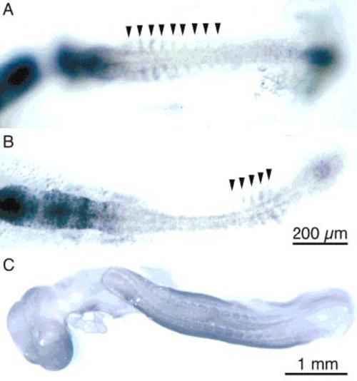 Sox11 gene expression in somites of zebrafish and quail. A,B: Flatmounts of 14-somite stage zebrafish embryos, revealing differential expression of sox11a in the nine anterior somites and sox11b in the five posterior somites (black arrows). C: A wholemount of a stage 13 quail embryo showing expression of SOX11 in all the somites. Scale bars = 200 µm and 1mm. |