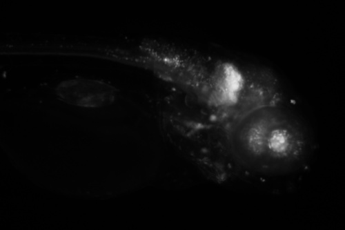 View of larva transgenic for y338Et and Tg(UAS:Kaede)s1999t, which expresses Kaede in pretectum (migrated area), optic tectum (anterior/lateral), medulla oblongata (rostral), neuromasts (sparse) and retina . |