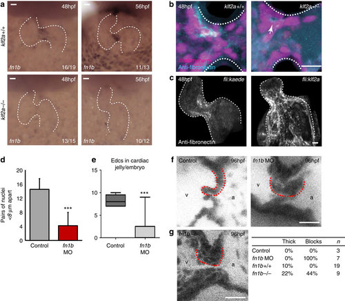 Klf2a expression regulates fibronectin synthesis in the AVC to drive valve formation. (a) in situ hybridization analysis shows the fn1b mRNA expression in the AVC of klf2a+/+ embryos, at 48 and 56 hpf, is lost in the majority of klf2a-/- embryos. (b) Immunofluorescence analysis shows reduced fibronectin-positive staining (cyan) in the AVC of klf2a-/- mutants (n=12 klf2+/+, n=18 klf2a-/-). A z-projection of the whole AVC is shown. (c) Forced expression of Klf2a in EdCs using the Tg(fli:gal4FFubs; UAS:klf2a) line results in fibronectin-positive staining in the atrium and ventricle (n=12/16) compared with the AVC-specific staining pattern in controls (n=12/14) in at least three independent experiments. A z-projection of the whole heart is shown. (d) Analysis of fn1b morphants showed defective cell clustering in the superior AVC at 48 hpf (control n=6, fn1bMO n=5) and (e) reduced numbers of nuclei in the cardiac jelly at 72 hpf (control n=5, fn1bMO n=9). (f) Live imaging of valves at 96 hpf showed leaflets fail to form in fn1b morphants (controls n=3, fn1bMO n=7). Single frames from the live imaging are shown and red dotted lines outline the superior valve leaflet in each case. The ventricle (v) and atrium (a) are labelled for orientation. (g) Single frames from the live imaging of fn1b-/- mutant hearts, quantification of the percentage of thick/blocked valves observed in fn1b MO, fn1b-/- mutant hearts and their respective controls. Student’s t-test ***P<0.005, **P<0.01, *P<0.05. Scale bars, 10 µm. |
