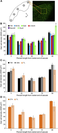 Hair bundle density in the zebrafish saccule. (A) Schematic of the saccular epithelium showing the location of our five sampling regions along the rostral-caudal axis. The confocal image on the right is an example of a phalloidin-labeled saccule. All boxes are 50 × 50 μm and are drawn to scale. V = ventral, R = rostral. (B) Comparison of bundle density in *AB fish and transgenic lines on a *AB background. Hair bundle density significantly differs by genotype and saccular location (2-way ANOVA, F5,225 = 6.88, p < 0.001; and F4,225 = 79.06, p < 0.001, respectively). Bonferroni-corrected posthoc tests were then used to compare each transgenic line to the *AB wildtype fish, where **p < 0.01 indicates significant differences from *AB at that saccular location. (C) There is no significant difference in saccular hair bundle density between wildtype strains (2-way ANOVA, F2,96 = 2.65, p = 0.07). (D) Saccular bundle density does not differ between transgenic ET4 fish and wildtype TL fish (2-way ANOVA, F1,31 = 0.08, p = 0.78). Data are presented as mean ± S.E. N = 4–12 fish per group. |