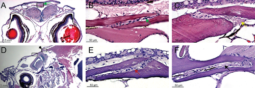 Histological examination of cranial sutures in adult zebrafish. H&E stained transverse sections (A-C) and sagittal sections (D-E) of skulls. (A) The interfrontal suture (boxed) and presented in (B) higher magnification; green arrows indicate the interfrontal suture between overlapping frontal bones. (C) The sagittal suture (yellow arrow) observed between two parietal bones. (D) The sagittal plane of sectioning revealed the coronal (left box) and lambdoid sutures (right box, black arrow). (E) The posterior frontal bone overlapping the anterior portion of the parietal bone, with the coronal suture formed between them (red arrow). (F) The lambdoid suture (black arrow) separates the parietal (upper plate) and the supraoccipital bone (lower plate). |