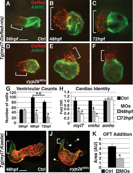 Cyp26-deficient embryos fail to add ventricular cardiomyocytes. (A–F) Control (Ctrl) and Cyp26-deficient Tg(myl7:DsRed2-NLS) embryo hearts at 36 (A,D), 48 (B,E), and 72 hpf (C,F). Ventricles are red only (brackets) and atria are green (AMHC immunostaining). (G) Graph indicating cardiomyocyte counts at 36 (n = 10 for control and n = 8 for Cyp26 deficient), 48 (n = 15 per group) and 72 hpf (n = 15 per group). (H) Graph indicating fold difference of mRNA relative to β-actin assayed with RT-qPCR for the cardiac differentiation markers myl7, vmhc, and amhc. (I,J) Confocal images of hearts from Tg(myl7:Kaede) embryos at 48 hpf that were photoconverted at 36 hpf. Brackets indicate ventricular addition (green only cells) to the hearts. Arrows denote cardiomyocytes outside of the heart tube. (K) Graph depicting quantification of the amount of ventricular addition to the OFT (n = 8 per group). Frontal views, anterior up (A–F); n > 20 embryos per group (A-F,I,J). Error bars are standard error of the mean (SEM), asterisks denote p < 0.05 compared to controls by Student’s t test. Scale bar: 50 μm. |