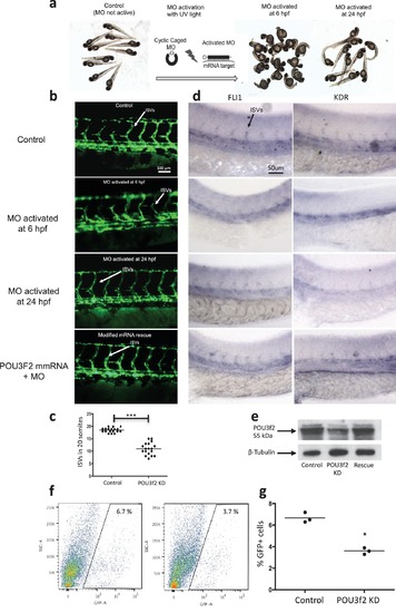 Pou3f2 knockdown in the tg(fli1:EGFP)y1 zebrafish embryo. (a) Bright-field images of embryos injected with caged morpholino against Pou3f2 translation start site in the absence of photoactivation (control), or with photoactivation with UV light at 6 or 24 hpf. (b) Fluorescence images of embryos at 48 hpf. Experimental groups were injected with caged morpholino against Pou3f2 in the absence of photoactivation (control), or with photoactivation with UV light at 6 or 24 hpf, or with photoactivation at 6 hr in the presence of rescue mRNA encoding Pou3f2. (c) Quantitation of the number of intersegmental vessels in 20 somites in embryos at 48 hpf. (d) In situ hybridization with antisense RNA probes specific for Kdr and Fli1 in whole zebrafish embryos 28 hpf. (e) Western blotting showing the reduction level of Pou3f2 following morpholino injection and rescue by mRNA encoding Pou3f2. β-Tubulin was used as loading control. ISV – Intersegmental Vessels; hpf – hour post fertilization. (f and g). Representative FACS plot and scatter plot showing a significant reduction of GFP+ cells in Pou3f2 KD embryos. GFP+ cells were sorted following isolation by enzymatic digestion from tg(fli1:EGFP)y1 zebrafish embryos at 24 hpf. All data represented as mean ± S.E.M. N = 3. Student t-test, *p=0.01; ***p=0.001.  |
