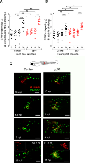 The absence of Gp91 results in increased bacterial burden and neutrophil persistence during subcutaneous infections. (A) Bacterial burden over time after subcutaneous injection of B. cenocepacia K56-2 in control (black circles) and gp91 knockdown embryos (open red circles). Average of two independent experiments. (B) Bacterial burden over time after subcutaneous injection of B. stabilis LMG14294 in control (black circles) and gp91 knockdown embryos (open red circles). Average of three independent experiments. (C) Fluorescent overlay images of the injected area of a representative mpx:GFP control MO and gp91 knockdown embryo (neutrophils in green) in time after subcutaneous injection with B. stabilis (red). Inset shows bacterial load at ~20 hpi. % at 22 and 21 hpi indicates percentage of control and gp91 knockdown embryos that show reduced neutrophil numbers (86.8%), and persistent neutrophil infiltration (71.3%), respectively, at the infection site. Scale bar, 100 μm. (A,B) * p ≤ 0.05; **** p ≤ 0.0001; ns: non-significant. See materials and methods for statistical tests. |