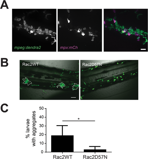 Neutrophil crosstalk drives macrophage aggregate formation. (A) Double transgenic Tg(mpeg:dendra2) x Tg(mpx:mCherry) larvae show that neutrophils are present in and around macrophage aggregates. Images at 40X; scale bar is 20 μm. (B) Representative 20X images of Rac2WT or Rac2D57N larvae at 24 hpi following inoculation. Tg(mpx:mCherry-2a-rac2wt) (Rac2WT) or Tg(mpx:mCherry-2a-rac2d57n) (Rac2D57N) were crossed to Tg(mpeg1:dendra2) and the resulting double transgenic larvae were infected with 50 CFU WT S. iniae or mock-infected with PBS. Rac2D57N larvae are defective for aggregate formation. Scale bar is 80 μm. (C) Quantification of the average total percent of larvae forming macrophage aggregates from (B). |