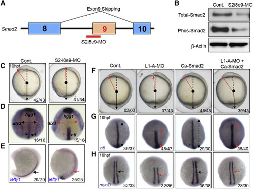 The C&E Defects in Like1 Morphants Can Be Rescued by Re-establishing smad2 Signaling (A) Schematic of the morpholino used to induce exon 9 skipping (S2-i8e9-MO). (B) Immunoblotting of detergent extracts reveals a reduction in total and phospho-Smad2 protein expression in the S2-i8e9-morphants. (C–E) S2-i8e9-MO induction of smad2 mis-splicing phenocopied the C&E defects caused by Like1 knockdown, as indicated by altered morphology (C, red arrow) and alterations in ntl/hgg1/dlx3b and lefty1 expression and distribution, as measured by in situ hybridization (D, 10 hpf, red arrows, anterior dorsal view; E, 16 hpf, lateral view). (F–H) mRNA encoding constitutively activated smad2 (Ca-Smad2, 20 pg) was used for injection alone or co-injected with Like1-A-MO. Embryo morphology (F) as well as the abnormal distribution of ntl (G, red arrows) and myod1 (H, red arrows) at 10 hpf can be rescued by ectopic expression of Ca-Smad2. All embryos are dorsal view with the anterior on top at 10 hpf. All results are representative of at least three experiments performed. See also Figure S3.
