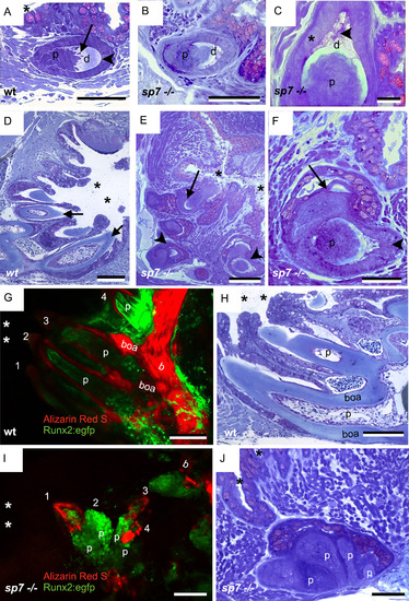 Tooth abnormalities in thesp7mutant. Toluidine blue stained 2 µm sections of teeth in 6 months old wt (A, D and H) and sp7 mutant (B-C, E-F and J) zebrafish. Confocal imaging of teeth in 5 months wt and sp7 -/- zebrafish (G and I, respectively). A) Replacement tooth of a wt, with enameloid (arrowhead) and dentin (d) containing tubules (arrow), with predecessor tooth (asterisk) partly visible, localized in proximity of the pharyngeal epithelium. B) Overview of a defective tooth in the sp7 mutant with a thin layer of dentin (d) and highly cellular pulp (p). C) Magnification of a sp7 mutant tooth. Note small amount of dentin (d) and enameloid with traces of organic matter (arrowhead) but well organized enamel organ with polarized ameloblasts (asterisk). Note densely cellular pulp (p). D-E) Lower magnification picture to show the pharyngeal cavity (asterisks) and tooth arrangement in wt (D) and sp7 mutant (E). In wt, teeth are oriented with tooth tips (arrows) pointing to the pharyngeal cavity (asterisks), while in the sp7 mutant some teeth have an abnormal orientation with their tip (arrow) turned away from the pharyngeal cavity. Pairs of teeth can also be observed (arrowheads). F) A pair of tooth germs (predecessor, arrow and successor, arrowhead). These germs have an orientation relative to each other much as in the wt (compare with A). Note that the densely cellular pulps of both germs are interconnected without sharp boundary. G-J) Confocal imaging (G, I) and histological sections (H, J) of similar teeth to show pulps in wt (G, H) and sp7 mutant (I, J). G, I). wt (G) and sp7 mutant (I) carrying (Tg(RUNX2:egfp) and stained for Alizarin Red S, imaged using confocal microscopy followed by 3D projection. The pharyngeal cavity region (asterisks), pharyngeal bone (b) and bone of attachment (boa, in wt only) are labelled. Numbers label the different teeth. Note that the bone of attachment delimits each pulp (p) in the wt (G) while in sp7 mutants (I) the lack of bones of attachment leads to abnormally connected pulps (p). H, J) Toluidine blue stained 2 µm cross section of pulps (p) in wt (H) and multi-pulps (p) connected in the sp7 mutant (J). The pharyngeal cavity region is indicated by asterisks and the bone of attachment (boa) is labelled in the wt. Scale bars A, B, F and J = 50 µm; C = 20 µm; D, E, G, H and I= 100 µm. |