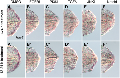 Multiple signaling pathways regulate the onset and maintenance of has3 expression during larval tail regeneration. Expression of has3 in 1-dpa (3-dpf) larval tails treated with the following signaling pathway inhibitors for the first 24 hours after amputation: (A, A’) 0.5% DMSO. (B, B’) 75 μM PD173074 (FGF). (C, C’) 10 μM LY294002 (PI3K). (D, D’) 50 μM SB431542 (TGFß). (E, E’) 5 μM SP600125 (JNK). (F, F’) 50 μM DAPT (Notch). At least 30 larvae were analyzed for each experimental condition, and phenotypic descriptions were based on a penetrance of > 80%. Scale bar: 100 μm. |