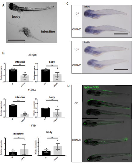 (A) Image illustrating the separation of intestinal tissues from body tissues, prior to RNA isolation and qPCR analysis of intestinal versus body (B) q-PCR analysis comparing the relative expression levels of cebpb, fosl1a and il1b, in conventionalized (CONVD) versus germ-free (GF) conditions in samples derived from excised intestinal bulp and in the remaining body tissues, (mean ± s.e.m, n=3 biological replicates, 30 embryos per group) **p0,01; ****p0,0001 by Student’s t-test (C) Wholemount in sity hybridization results of cebpb and fosl1a, scale bar represents 1 mm (D) Representative images of germ-free and conventionalized larvae in the Tg(il1b:GFP) reporter line stitched from confocal stacks acquired with 10x magnication scalebars, 500 μm in A and D; 1 mm in C. |