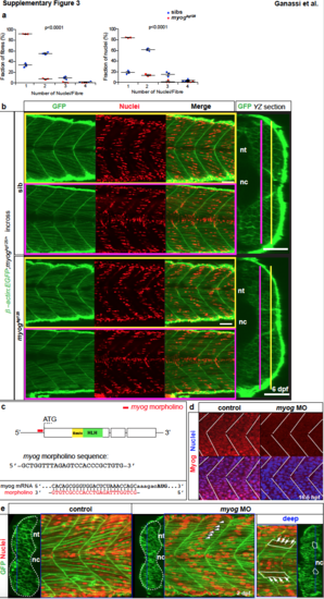 Lack of fusion in myogkg125 and myogkg128 persists until 6 dpf and is phenocopied by Myogenin knockdown. a. Individual quantification of fusion within somite 17 (summarized as pie charts in Fig. 4e-f) showing fraction of fibres with given number of nuclei and fraction of nuclei in fibres with given number of nuclei. Dots represent individual embryos. Mean ± SEM. b. Lack of fusion persists in myog mutants. GFP staining of β-actin:EGFP; myogkg125/+ incross at 6 dpf. Nuclei were stained with Hoechst (red). Transverse sections (YZ) report position of parasaggital sections (pink and yellow lines). c. Schematic of myog mRNA showing the position and nucleotide sequence of morpholino (red bold line), which anneals close upstream of ATG start codon. d. To knock down Myog, morpholino (MO) was injected at 1-cell stage into β-actin:EGFP embryos. Myog immunodetection and Hoechst stained nuclei (blue) at 16.5 hpf showed loss of nuclear Myog immunoreactivity in MO embryos. White lines indicate somite borders. e. At 2 dpf, MO and control injected embryos were fixed and incubated with Hoechst to highlight nuclei (red) prior to confocal imaging. As in myog mutants, knockdown of Myog led to overabundance of smaller mononucleated muscle fibres and reduced the size of the myotome. Multinucleated fibres remained in deep regions (‘deep’, right panel) of the myotome. White dashed lines outline somite cross-section, white plain lines outline multinucleated fibres, arrows indicate nuclei within a fibre and blue line indicates the position of the cross sections. nt; neural tube, nc; notochord. Replicate numbers are given in Supplementary Table 2. Bars = 50 μm. |