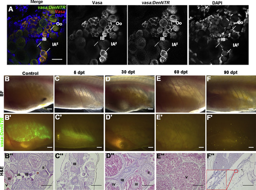 Ovary Regeneration Is Defective after Genetic Ablation of GSCs and Sex Reversal Finally Occurs (A) Comparison of Vasa protein and vasa:DenNTRexpression in ovary shows the Dendra2 fully overlaps with Vasa, suggesting that vasa:DenNTR is able to label all of the germ cells. (B–B″) The Tg(vasa:DenNTR)cq41 females of about 3 months old have big ovaries in bright field (BF) (B), strong green fluorescent (B′), and different stage germ cells (B″). (C–C″) At 5 dpt, the ovarian size largely decreases (C and C′) and except stage I and II oocytes, the germ cells are ablated by Mtz (C″). (D–D″) The ovaries become large and have mature oocytes at 30 dpt (D) but little green fluorescent is observed (D′), and the early stage germ cells were not detected (D″). (E–E″) By 60 dpt, the fish ovaries only have stage V cells. (F–F″) Testis (arrowheads) that lack germ cells appears at 90 dpt, showing that the females treated with Mtz reverted to sterile males. Oo, oogonia; IAz, zygotene-stage-IA; IA, stage IA oocytes; IB, stage IB oocyte; II, stage II oocyte; III, stage III oocyte; IV, stage IV oocyte; V, stage V oocyte. Scale bars: 50 μm (A), 1 mm (B–F′), 200 μm (B″–F″). See also Figure S2. |