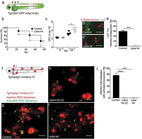(a) Region of interest (blue square) for confocal image acquisition of infected phagocytes in the blood circulation in d and d’. (b) Survival curves of S. Typhimurium-infected control and cyba knockdown embryos. One representative of three replicates is shown. (c) Representative CFU counts of S. Typhimurium- infected control and cyba knockdown embryos. Five embryos/larvae per time point were used and the log transformed CFU data are shown with the geometric mean per time point. (d) Representative confocal images of control (d) and cyba (d’) knockdown embryos at 4 hpi. (e) Quantification of GFP-Lc3-Salmonella associations in control and cyba knockdown embryos at 4 hpi. Numbers of infected phagocytes positive or negative for GFP-Lc3-Salmonella associations were counted from confocal images and the percentages of Lc3-positive over the total were averaged from five embryos per group. Error bars represent the SD. (f) Region of interest (blue square) for confocal image acquisition of infected phagocytes in the blood circulation of Tg(mpeg1:mCherry-F) embryos in g-i. Red stars symbolize the mCherry-expressing macrophages in the transgenic line used for this experiment. (g-i) Representative confocal images of Tg(mpeg1:mCherry-F)umsF001 embryos at 4 hpi following injection of a Salmonella ROS biosensor strain into control (g), and rubcn kd(2) (h) or cyba morpholino knockdown groups (i). The ROS biosensor strain expresses a constitutive mCherry marker and the GFP signal indicates ROS biosensor activation. Macrophages in the Tg(mpeg1::mCherry-F) line express a farnesylated mCherry protein localizing to membranes (arrows) and therefore the signal is separated from bacterial mCherry signal. (j) Quantification of ROS biosensor activation at 4 hpi in control, rubcn kd(2) and cyba morpholino knockdown groups of Tg(mpeg1::mCherryF) embryos at 4 hpi. Numbers of macrophages showing ROS biosensor activation (GFP and mCherry bacterial signals) or without ROS biosensor activation (mCherry bacterial signal only) were counted from confocal images and the percentages of ROS biosensor-positive over the total were averaged from five embryos per group. Error bars represent the SD. Scale bars: 10 μm. ****P < 0.0001, **P < 0.01, *P < 0.1. |
