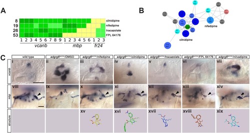 Hit compounds from the vcanb screen vary in their ability to restore mbp expression in adgrg6tb233c mutant embryos.(A) Section of the heatmap in Figure 5A showing the results for nifedipine, cilnidipine, tracazolate hydrochloride and FPL 64176. (B) Enlargement of the dihydropyridine cluster (cluster 1 in Figures 4G and 5B), highlighting cilnidipine and nifedipine. Compounds that rescued mbp expression are shown as larger nodes, whereas compounds that did not rescue mbp expression are shown as smaller nodes. The relationship of nilvadipine (green circle) to the other compounds in this cluster is also illustrated. (C) (i–vii) Lateral images of the inner ear at 4 dpf stained for vcanb by ISH. (i) Wild-type, (ii) adgrg6tb233c mutant treated with DMSO as a control, (iii–vii) treatment of adgrg6tb233c mutants with test compounds at 25 µM, with the exception of nilvadipine, which was tested at 22.5 µM. (viii–xiv) mbp mRNA expression of embryos treated as indicated above. Black arrowheads indicate mbp expression around the PLLg; white arrowhead in (ix) indicates the position of the PLLg in the untreated mutant, lacking mbp expression. Nifedipine, cilnidipine, tracazolate hydrochloride and nilvadipine all rescued mbp expression around the PLLg, whereas FPL 64176 did not rescue mbp expression around the PLLg so efficiently. (xv–xix) Representation of the chemical structures of the five compounds tested. Scale bar in (i), 50 µm (applies to i-vii); scale bar in viii, 50 µm (applies to viii–xiv).