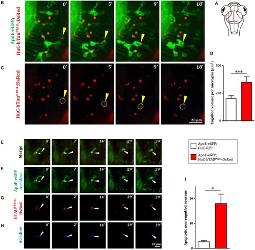 Microglia phagocytic activity is increased in presence of hTauP301L-expressing, but appears non-sufficient in eliminating all apoptotic neurons. (A) Schematic illustration of 7 dpf embryo in dorsal view. The red square shows the region of the optic tectum where the time-lapse (B,C) was recorded. (B,C) Time-lapse imaging of a microglial cell phagocyting a diseased neuron (yellow arrowhead) in a 7 dpf Tg(ApoE-eGFP; HuC-hTauP301L:DsRed) embryo; (B, Supplementary Video 3) merge of GFP and DsRed; (C) DsRed only. (D, p = 0.0262) Quantification of the engulfed neuronal volume in Tg(ApoE-eGFP; HuC-RFP) (n = 7) and Tg(ApoE-eGFP; HuC-hTauP301L:DsRed) (n = 9) embryos, showing a significantly increased phagocytosis level by microglial cells in the presence of hTauP301L-expressing neurons. (E–H, Supplementary Video 4) Time-lapse image sequences from the optic tectum of a double transgenic Tg(ApoE-eGFP; HuC-hTauP301L:DsRed) 7 dpf embryo, showing a detail of a microglial cell in the process of phagocyting a neuron labeled with an apoptosis marker, acridine orange (merge: E, GFP and acridine: F, DsRed only: G, acridine only: H). The microglial cell filled with other dead tauopathic neurons extends its process to another dying tauopathic neuron and draws it toward its body cell to complete the phagocytosis process. (I, p = 0.027), Quantification of the number of non-engulfed apoptotic neurons in Tg(ApoE-eGFP; HuC-RFP) (n = 11) and double transgenic Tg(ApoE-eGFP; HuC-hTauP301L:DsRed) (n = 4) embryos in which there is a significantly higher number of non-engulfed apoptotic neurons. ***p < 0.001; *p < 0.05. Scale bar (B,C,E–H) = 20 μm.