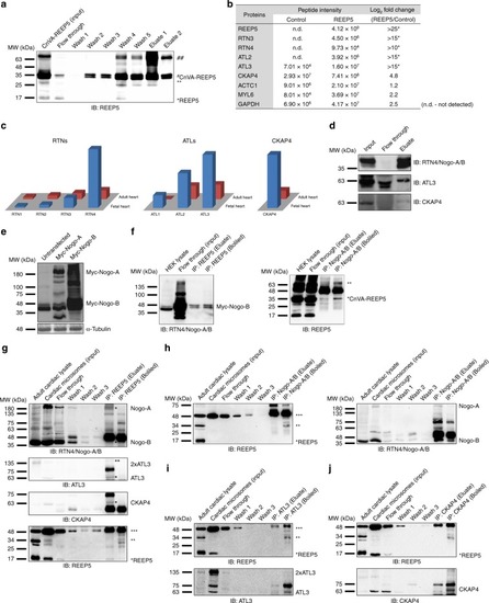 Mass spectrometry analysis identifies REEP5 interactions with known cardiac SR shaping proteins.a Immunoblot analysis of nickel-His purification of CnVA-REEP5 from transfected HEK293 cells shows stable expression of CnVA-REEP5 and successful immunoprecipitation of CnVA-REEP5 monomer (~34 kDa) and dimer (~68 kDa). b Identification of known SR/ER-shaping proteins as REEP5 interacting proteins by mass spectrometry analysis. Average precursor MS1 peak areas (peptide m/z signal) as defined by iBAQ (intensity based absolute quantification) are shown, n = 3 independent mass spectrometry runs. To calculate fold change, average null values (n.d.—not detected) were inputted with a value of 10. RTN reticulon, ATL atlastin, CKAP4 cytoskeleton-associated protein 4, ACTC1 alpha cardiac muscle actin 1, MYL6 myosin light chain 6, GAPDH glyceraldehyde-3-phosphate dehydrogenase. Asterisks indicate a statistically significant p value in a Tukey’s multiple comparison analysis where *p < 0.05. c RNASeq analysis of the RTN, ATL families of proteins, and CKAP4 in human fetal heart and adult heart tissue data using data from Human Protein Atlas. d Immunoblot analysis of nickel-His REEP5 immunoprecipitation lysates for RTN4/Nogo-A/B, ATL3, and CKAP4, n = 3. e HEK293 cells were transfected with myc-tagged Nogo-A and Nogo-B plasmids and detected with myc and α-tubulin antibodies. f Co-immunoprecipitation assay of cotransfected HEK293 cells with anti-REEP5 antibody (left panel) and anti-RTN4/Nogo-A/B antibody (right panel) demonstrated interaction between REEP5 and RTN4, n = 3. Eluates were collected on ice and loaded directly for blotting, or samples were boiled prior to blotting. g–j Co-immunoprecipitation and reverse order co-immunoprecipitation assays with g anti-REEP5, h anti-RTN4/Nogo-A/B, i anti-ATL3, and j anti-CKAP4 antibodies in adult mouse cardiac microsomes (input), followed by immunoblots analysis, n = 5. Source data containing original uncropped immunoblots are provided as a Source Data file.