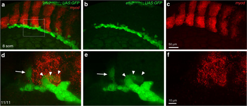 Fluorescent in situ hybridization for myod expression in etv2ci32Gt+/−; UAS:GFP embryos.In situ hybridization was performed using hybridization chain reacion (HCR) at the 8–10-somite stages. a–c Maximum intensity projection is shown; d–f An area boxed in a was imaged at higher magnification; maximum intensity projection of three confocal slices is shown. Note that most GFP-expressing cells are positioned in the lateral plate mesoderm, while some cells are starting to migrate toward the midline (arrow, d, e, points to a migrating angioblast which does not have myod expression). GFP and myod co-expressing cells (arrowheads, d, e) are apparent at the posterior edge of the somite. The punctate myod expression pattern is due to the nature of the HCR probe. Dorsolateral view, anterior is to the left. The numbers in the lower left corner display the number of embryos showing the phenotype out of the total number of embryos analyzed in two replicate experiments.