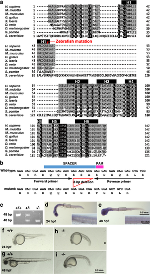 Generation of zebrafish polr2d mutant zebrafish. (a) Multiple amino acid sequence alignment of Polr2d/Rpb4 protein. Black and grey colors respectively indicate completely and highly conserved residues among eukaryotes. Black boxes H1–H6 mark the region of helix domain 1–6. The position of frame-shift mutation in zebrafish is indicated by a red arrow in H1. Following NCBI data were used: human (H. sapines) NP_004796; rhesus monkey (Macaca mulatta) NP_001254716; mouse (Mus musculus) NP_081278; chicken (Gallus gallus) NP_001264338; african clawed frog (Xenopus laevis) NP_001087315; zebrafish (Danio rerio) NP_001002317; fruit fly (Drosophila melanogaster) NP_001014633; fission yeast (Schizosaccharomyces pombe) NP_595415; budding yeast (Saccharomyces cerevisiae) NP_012395. (b) A genomic deletion and a consequent frame-shift mutation in zebrafish polr2d. The 8-bp deletion was generated in the spacer sequence of the CRISPR. The position of forward and reverse primers for genotyping are indicated. (c) Genotyping PCR. The size of wild-type and mutant bands were 48 and 40 bp, respectively. (d, e) Spatial and temporal expression of polr2d. Whole-mount in situ hybridization of polr2d in zebrafish embryos at 24 hpf (d) and 48 hpf (e). Magnified views of the boxed region indicate polr2d expression in the spinal cord. (f–i) Images of polr2d mutants. The polr2d mutants showed developmental defects at 24 hpf (h) and 48 hpf (i) compared to wild-type (f, g). Note that small eye and cardiac edema were evident in mutants at 48 hpf.