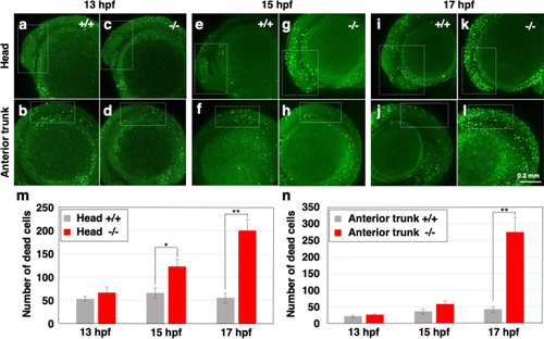 Increase of cell death in polr2d mutants. (a–l) Images of acridine orange-labeled dead cells in zebrafish embryos. White dotted boxes mark the head (anterior to midbrain/hindbrain boundary; a, b, e, f, i, j) and anterior trunk (somite 1–4; c, d, g, h, k, l) regions. (m, n) The number of dead cells in the head (m) and anterior trunk (n) regions. Note that cell death in mutants increased at the onset of 15 hpf in the head and at the onset of 17 hpf in the anterior trunk. n = 7 for each sample set. |