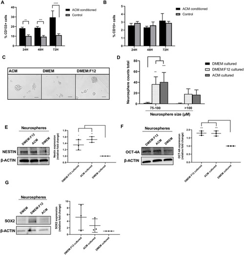 (A) Percentage of CD133 positive cells cultured in ACM or DMEM (control), measured by flow cytometry at 24, 48, and 72 h. (B) Percentage of CD15 positive cells cultured in ACM or DMEM (control), measured by flow cytometry at 24, 48, and 72 h. (C) Representative images of Daoy cells cultured in neurosphere conditions using the respective media for 48 h. Scale bar is 100 μm. (D) Total number of neurospheres counted in all images between 75–100 μm or >100 μm at 48 h, cultured in the respective media. (E) Western blot analysis of Nestin, (F) Oct-4A and (G) Sox2 expression in respective neurosphere culturing conditions at 48 h. β-actin served as a loading control (left). Quantification of relative fold change of Nestin, Oct-4A and Sox2 expression, measured by the densitometry of western blot bands and normalized to β-actin (DMEM condition set to 1) (right). Quantified values expressed as mean +/- SD. *p<0.05, **p<0.01, ***p<0.001, ****p<0.0001. |