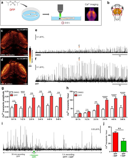 DFP exposure caused neuronal hyperexcitation. (a) As experimental set-up, 5 dpf Tg[Huc:GCaMP5G] larvae were exposed to either 15 µM DFP or vehicle (1% DMSO), and calcium transients were recorded in brain neurons during the next 6 h. (b) Scheme of a 5 dpf larva head with the red box showing the region of interest in the brain, uncovering the optic tectum (OT). (c,d) Snapshot views of calcium imaging in a 5 dpf Tg[Huc:GCaMP5G] larva brain showing baseline calcium transients (c in Fig. 2e) and seizure-like hyperactivity seen 3 h after exposure to 15 µM DFP (d in Fig. 2f). (e,f) Baseline calcium transients detected in 5 dpf Tg[Huc:GCaMP5G] control larvae (n = 3) (e) and massive calcium transients detected in 5 dpf Tg[Huc:GCaMP5G] larvae exposed for 6 h to 15 µM DFP (n = 4) (f). (g) Amplitude of calcium transients detected in 5 dpf Tg[Huc:GCaMP5G] larvae at different time points following exposure to either 15 µM DFP (n = 4) or vehicle (n = 3) (two-way ANOVA with Sidak’s multiple comparisons test: n.s., non-significant; **, p < 0.01; ***, p < 0.001). (h) Number of calcium transients showing ΔF/F0 > 0.04 in 5 dpf Tg[Huc:GCaMP5G] larvae at different time points following exposure to either 15 µM DFP (n = 4) or vehicle (n = 3) (two-way ANOVA with Sidak’s multiple comparisons test: n.s., non-significant; **, p < 0.01; ****, p < 0.0001). (i) Pattern of calcium transients seen in 5 dpf Tg[Huc:GCaMP5G] larvae exposed for 5 h to 15 µM DFP and then to 15 µM DFP + 40 µM diazepam (DZP) for an additional hour. (j) Number of calcium transients showing ΔF/F0 > 0.04 in 5 dpf Tg[Huc:GCaMP5G] larvae exposed for 5 h to 15 µM DFP and then to 15 µM DFP + 40 µM diazepam (DZP) for an additional hour (n = 6) (Student’s unpaired t-test: **, p < 0.01).