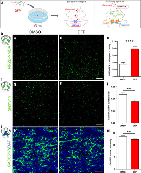 DFP exposure caused increased NR2B-NMDA subunit receptor accumulation combined with decreased gephyrin and GABA signaling. (a) As experimental set-up, 5 dpf larvae were exposed to either 15 µM DFP or vehicle (DMSO) for 6 h, prior to being processed for NR2B-NMDA, gephyrin or GAD 65/67 immunolabeling. (b) Scheme of 5 dpf larva head highlighting the tectal neuropils in green. (c,d) NR2B-NMDA receptor immunolabelling of 5 dpf larvae brains exposed to either DMSO (c) or 15 µM DFP (d). Scale bar: 5 µm. (e) Quantification of NR2B-NMDA puncta density in 5 dpf larvae treated for 6 h with either DMSO (N = 4; n = 22) or 15 µM DFP (N = 4; n = 26) (Mann Whitney : ****, p < 0.0001). (f) Scheme of 5 dpf larva head highlighting the tectal neuropils in green. (g,h) Gephyrin immunolabelling of 5 dpf larvae brains exposed to either DMSO (g) or 15 µM DFP (h). Scale bar: 5 µm. (i) Quantification of gephyrin puncta density in 5 dpf larvae treated for 6 h with either DMSO (N = 4; n = 18) or 15 µM DFP (N = 4; n = 18) (Student unpaired t-test: **, p < 0.01). (j) Scheme of 5 dpf larva head highlighting stratum periventriculare in blue and green. (k,l) GAD65/67 immunolabelling of neurons in the optic tectum of 5 dpf larvae brains exposed to either DMSO (k) or 15 µM DFP (l). Scale bar :10 µm. (m) Quantification of the density of neurons expressing GAD65/67 protein in the optic tectum of 5 dpf larvae exposed to either DMSO (N = 4; n = 18) or 15 µM DFP (N = 4; n = 19) (Student unpaired t-test : **, p < 0.01). N = number of larvae and n = number of slices.