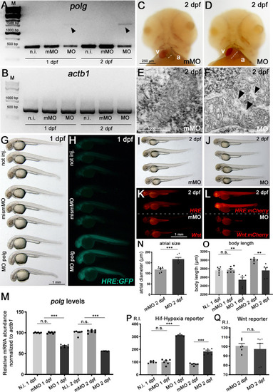 polg morphants characterization and specific signalling pathway alteration.A, B Molecular validation of polg-specific morpholino oligos. Semi-quantitative RT-PCR from total cDNA of not injected (not inj), mismatched-morpholino (mismMO) injected controls and polg-specific morphants (MO), at 1 and 2 dpf, detects-specific alteration of polg transcripts. Arrowheads indicate altered cDNA products exclusively in polg morphant embryos (A). Control actb1 transcripts appear unaltered under all conditions (B). M marker. PCR experiments were performed in triplicate on cDNA samples derived from N = 30 whole embryos per condition. Quantifications are displayed in the (M) chart. C, D Cardiac dilation in polg morphants. Frontal views of control (C) and polg morphant (D) embryos at 2 dpf. Note the enlarged atrium in the morphant; a atrium, v ventricle. Atrial measurements are displayed in the (N) chart. E, F TEM analysis of mitochondria in the skeletal muscle of 2-dpf embryos: normal mitochondrial morphology in controls (E); fused and swollen mitochondria in morphants (altered areas indicated by black arrowheads (F). G–L Analysis of Hif-Hypoxia and Wnt signalling pathways under polg deficiency. Bright field (G, I, J) imaging shows a decreased body length, in the absence of overt dysmorphology, in 1 and 2-dpf morphant embryos; measurements are displayed in the (O) chart. Fluorescence (H, K, L) imaging of Hif-Hypoxia (HRE Hif-Hypoxia Responsive Elements) and Wnt signalling reporters shows strong activation of the Hif-Hypoxia pathway under polg-deficieny, in both green (H) and red (K, L) transgenic background. On the contrary, Wnt signalling appears unchanged (compare K with L). Relative intensity (R.I.) quantifications of the fluorescent signals are displayed in the (P) and (Q) charts. Statistical tests: one-way ANOVA followed by Tukey’s test; ***p < 0.0001; **p < 0.001; n.s. not significant; N = 6 samples per condition, in triplicate.