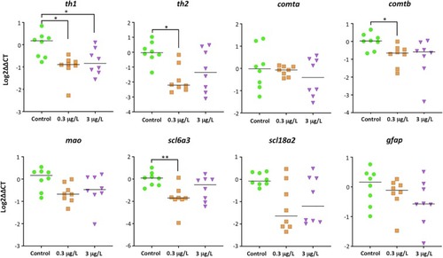 Fig. 3. Effect of two weeks exposure to 0.3 and 3 μg/L glyphosate on the expression of genes associated with the dopaminergic system (th1, th2, comta, comtb, mao, scl6a3, scl18a2 and gfap) in the anterior-middle brain regions of adult zebrafish. Data reported as scatter plot with the median. *P < 0.05, **P < 0.01; one-way ANOVA with Dunnett’s multiple comparison test (th1, th2, comta, mao, scl6a3, gfap) or Kruskal Wallis test with Bonferroni correction (comtb, scl18a2). Data from 2 independent experiments (n = 8). |