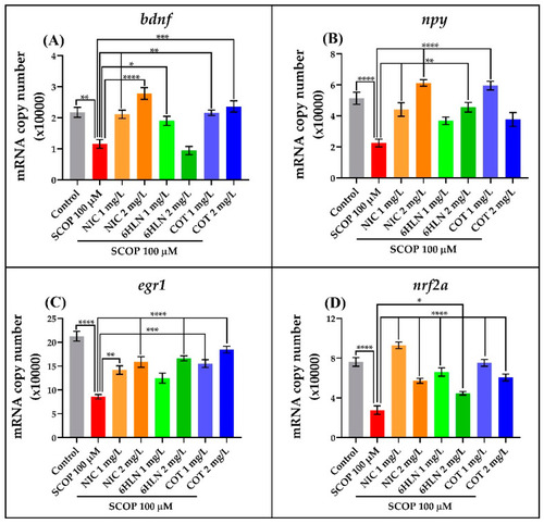 Effects of nicotine (NIC), cotinine (COT), and 6-hydroxy-L-nicotine (6HLN) (1 and 2 mg/L) administration on brain-derived neurotrophic factor (bdnf) (A), neuropeptide Y (npy) (B), early growth response protein 1 (egr1) (C), and nuclear factor erythroid 2-related factor 2 (nrf2a) (D) gene expression. The values are expressed as means ± S.E.M. (n = 4). ANOVA analysis identified overall significant differences between groups for (A) F(7,24) = 16.65, p < 0.0001, (B) F(7,24) = 14.79, p < 0.0001, (C) F(7,24) = 19.87, p < 0.0001 and (D) F(7,24) = 32.96, p < 0.0001. For Tukey posthoc analyses—**** p < 0.0001, *** p < 0.001, ** p < 0.01 and * p < 0.05. |