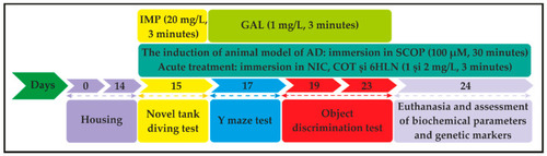 The timeline and experimental design of the study (IMP-imipramine; GAL-galantamine; AD-Alzheimer’s disease; SCOP-scopolamine; NIC-nicotine; COT-cotinine; 6HLN-6-hydroxy-L-nicotine). |
