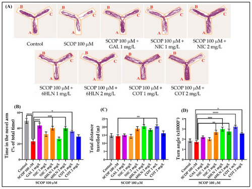 The effects of nicotine (NIC), 6-hydroxy-L-nicotine (6HLN), and cotinine (COT) (1 and 2 mg/L) administration in scopolamine (SCOP)-treated zebrafish on spatial memory and locomotor activity evaluated within the Y-maze task. (A) The representative locomotion tracking pattern of the zebrafish in the second stage of the Y-maze task according to the experimental groups they belong to. The arms of the maze were denoted with A (start arm), B (other arm), and C (novel arm). The blue dot represents the beginning of the route, while the red dot represents the end of the route. The time in the novel arm (B) represents a parameter for spatial memory, whereas the (C) total distance travelled and the (D) turn angle is measures of locomotor activity. The values are expressed as means ± S.E.M. (n = 10). ANOVA analysis identified overall significant differences between the experimental groups for (B) F(8,81) = 10.54, p < 0.0001, (C) F(8,81) = 5.342, p < 0.0001 and (D) F(8,81) = 8.96, p < 0.0001. For Tukey posthoc analyses—**** p < 0.0001, *** p < 0.001, ** p < 0.01and * p < 0.05.