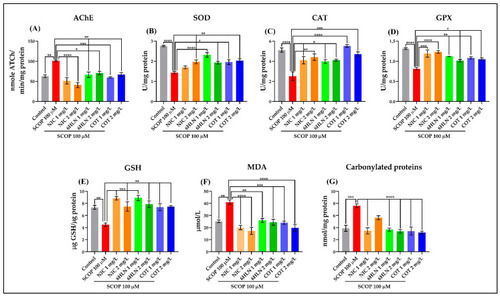 The effects of nicotine (NIC), 6-hydroxy-L-nicotine (6HLN), and cotinine (COT) (1 and 2 mg/L) administration in scopolamine (SCOP)-treated zebrafish on acetylcholine esterase (AChE)- (A), superoxide dismutase (SOD)- (B), catalase (CAT)- (C) and glutathione peroxidase (GPX)- (D) specific activities and the content of glutathione (GSH) (E), malondialdehyde (MDA) (F) and carbonylated proteins (G). The values are expressed as means ± S.E.M. (n = 3). ANOVA analysis revealed overall significant differences between the experimental groups for (A) F(7,16) = 11.5, p < 0.0001, (B) F(7,16) = 10.15, p < 0.0001, (C) F(7,16) = 11.31, p < 0.0001, (D) F(7,16) = 14.22, p < 0.0001, (E) F(7,16) = 8.541, p < 0.001, (F) F(7,16) = 12.39, p < 0.0001 and (G) F(7,16) = 14.53, p < 0.0001. For Tukey posthoc analyses—**** p < 0.0001, *** p < 0.001, ** p < 0.01 and * p < 0.05.