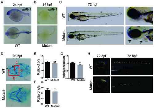 Loss of miR-1 in zebrafish results in craniofacial, pigment cell and cardiac defects. In situ hybridization of miR-1 in (A) wild-type and (B) mutant zebrafish at 24 hpf. (C) Zebrafish larvae at 72 hpf with mutants exhibiting mandibular retrognathia (left arrow) and edema around the heart (right arrow). (D) Alcian blue staining at 96 hpf. (E) Quantitative analysis of b/a. (F) Quantitative analysis of c/a. a, width between ch; b, distance between mc and ch; and c, the distance between pq and ch. (G) Quantitative analysis of head size. (H) Distribution and number of iridophores at 72 hpf. Data are presented as the mean ± standard deviation (n=5). *P<0.05 and **P<0.01 vs. WT. WT, wild-type; hpf, hours post-fertilization; miR-1, microRNA-1; mc, Meckel's cartilage; pq, palatoquadrate; ch, ceratohyal cartilage.