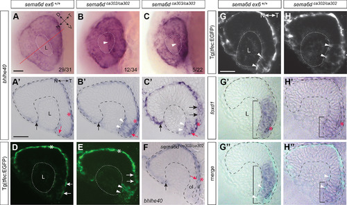 Disrupted RPE morphogenesis in sema6d mutants. A–C, Morphogenesis of the RPE is disrupted in sema6dca302 and sema6dca303 eyes as compared with wild-type, with mutants displaying ectopic bhlhe40 staining apparent through the transparent lens (white arrowhead in B, C). In the bottom right of panels are the number of embryos of the total analyzed that exhibited either a WT (A) or a disrupted (B, C) expression pattern. A’–C’, F, Transverse sections reveal full expansion of the bhlhe40+ RPE to abut the nasal lens (black arrows), while the RPE of the temporal eye fails to reach the lens in mutants (compare red arrows). RPE cells are expanded in the inner leaflet of wild-type embryos, but cuboidal in mutants (compare red asterisks). In most mutants the bhlhe40+ RPE not only failed to abut the lens, but bhlhe40 was ectopically expressed in the lateral portion of the temporal neural retina (white arrowheads in B’, C’), while in some sema6d mutants, bhlhe40 expression was restricted entirely to the inner eye vesicle leaflet (red arrow in F). D, E, Wild-type (D) and sema6dca302 mutant (E) embryos bred on a Tg(tfec:EGFP) background to label RPE progenitors. Mutants display ectopic EGFP expression in the temporal neural retina (arrowheads in E) and EGFP+ RPE cells in the temporal (early ventral) inner leaflet are cuboidal and not extended as in wild-type (compare arrows in D, E). G, H, Transverse sections of 22-hpf eyes of wild-type (G–G’’) and sema6dca302 (H–H’’) mutant embryos on a Tg(tfec:EGFP) background that were processed for GFP immunohistochemistry (G, H) and RNA ISH for the temporal neural retina marker foxd1 (G’, H’). Blended images (G’’, H’’). EGFP+ cells that co-express foxd1 are present in the distal temporal neural retina of both wild-type and mutant eyes (arrowheads in G, G’’, H, H’’). A few foxd1+ cells in the wild-type inner leaflet (asterisk in G’) have not yet moved around the distal rim, with many more present in the mutant inner leaflet (asterisk in H’). Scale bars: 50 μm (A, A’). D: dorsal, il: inner leaflet, L: lens, N: nasal, ol: outer leaflet, T: temporal, V: ventral.