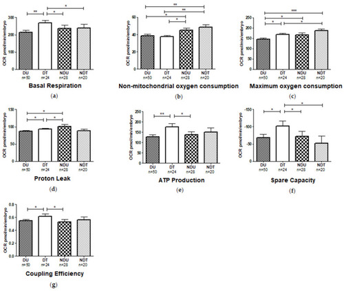 Mitochondrial respiratory analysis of Dystrophic Untreated (DU), Dystrophic Treated (DT), Non-dystrophic Untreated (NDU), Non-dystrophic Treated (NDT): (a) Basal respiration; (b) Non-mitochondrial oxygen consumption; (c) Maximum oxygen consumption; (d) Proton Leak; (e) ATP Production; (f) Spare respiratory capacity; (g) Coupling efficiency. Data are given as mean and standard error (* p ≤ 0.05, ** p ≤ 0.01, *** p ≤ 0.001). |