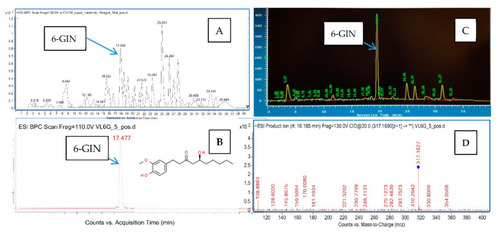The chromatograms and fragmentation spectra obtained for the total extract and the isolated 6-GIN. (A) the total ion chromatogram of the methanolic extract from Zingiber officinale rhizome recorded in the positive ionization mode; (B) the total ion chromatogram of the isolated 6-GIN recorded in the positive ionization mode; (C) the chromatogram from the semipreparative HPLC, recorded at 290 nm; and (D) the MS/MS fragmentation spectrum of 6-GIN. |