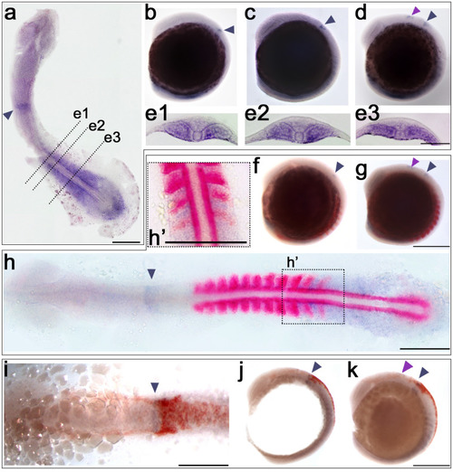 atoh8, myoD and crestin expression in early segmentation stages of development (13–14 hpf). a–eatoh8 ISH; f–hatoh8/myoD double ISH. i–katoh8/crestin double ISH. a Flat mount of 13.5-hpf embryo. b 13-hpf embryo showing first appearance of atoh8 in the developing hindbrain (dark arrowhead). c 13.5-hpf embryo. d Embryo at 14 hpf; pink arrowhead indicates the appearance of the second domain at the midbrain/hindbrain boundary. e1–e3 Sections through the 13-hpf embryo at the levels indicated in a. f, g Embryos at 13 hpf and 14 hpf, respectively, double-stained for atoh8 and myoD. h Flat mount of embryo at 14 hpf double-stained for atoh8 and myoD. i, j Flat mount and embryo showing double labelling for crestin and atoh8 at 13 hpf. k Embryo at 14 hpf double-stained for crestin and atoh8. a, h’ Dorsal view, anterior to the top. b–d, f, g, j, k lateral view, anterior to the top, dorsal to the right. h, i dorsal view, anterior to the left. Scale bars: whole embryos 200 µm, flat mounts a, h, i 200 µm; h’ 50 µm; transverse sections: 100 µm