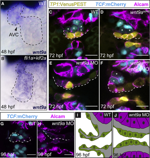 (A and B) Whole-mount (C–F) Single confocal z section plane images of the superior AVC endocardium at 72 hpf. (C and D) Normal atrioventricular valvulogenesis with TCF-positive cells on the abluminal side of the forming valve (asterisks) in wild-type (C) and (G and H) Single confocal z section plane images of the AVC endocardium at 96 hpf. (G) In wild type, the primordium of the AV valve leaflet has formed by 96 hpf. (H) Valvulogenesis is completely aborted and the AV endocardium remains monolayered at 96 hpf upon the MO-mediated knockdown of (I and J) Model depicting the AVC region of the zebrafish endocardium at 96 hpf. (I) Primordium of the wild-type valve leaflet (as in G). (J) AVC endocardium at 96 hpf upon loss of Wnt9a (as in H). Scale bars, 5 μm |